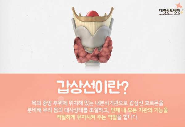 갑상선(thyroid 또는 thyroid gland)은 목의 중앙 부위에 위치해 있으며 거울을 보시면 앞쪽에 튀어나와 있는 갑상연골 바로 밑 2~3cm 아래에 위치합니다. 나비형태 모양의 장기로 좌엽과 우엽, 그리고 양 엽을 연결하는 협부로 구성되어 있습니다. 한 엽의 길이는 4~5cm, 너비 1~2cm, 두께 2~3cm이며 전체 무게는 15~20g 입니다. 갑상선은 우리 몸 전신에 필요한 갑상선호르몬을 분비하여 신진대사를 원활하게 하는 중요한 기능을 담당합니다.