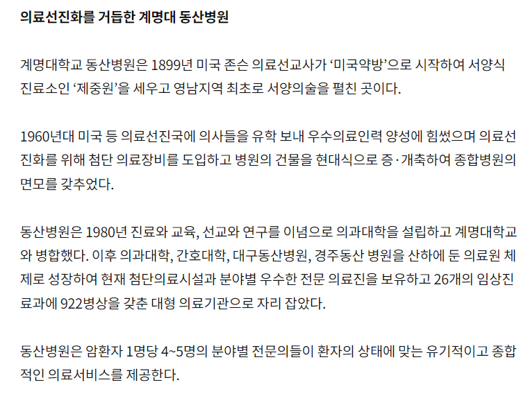 시설면에서는 계명대가 더 낫다는 의견이 있었다. 지하철에서 바로 연결이 되는 장점이 있다. 더불어 시설이 깔끔하고 의사선생님도 친철하시다고 입소문이 나있다. 맘카페에 가보면 항상 영남대와 계명대 중에 어디서 수술을 해야 더 나은가요? 라는 질문이 있는데 댓글들을 보면 반반이다. 제 추천은 집에서 가까운 병원이 정답이라고 할 수 밖에 ..